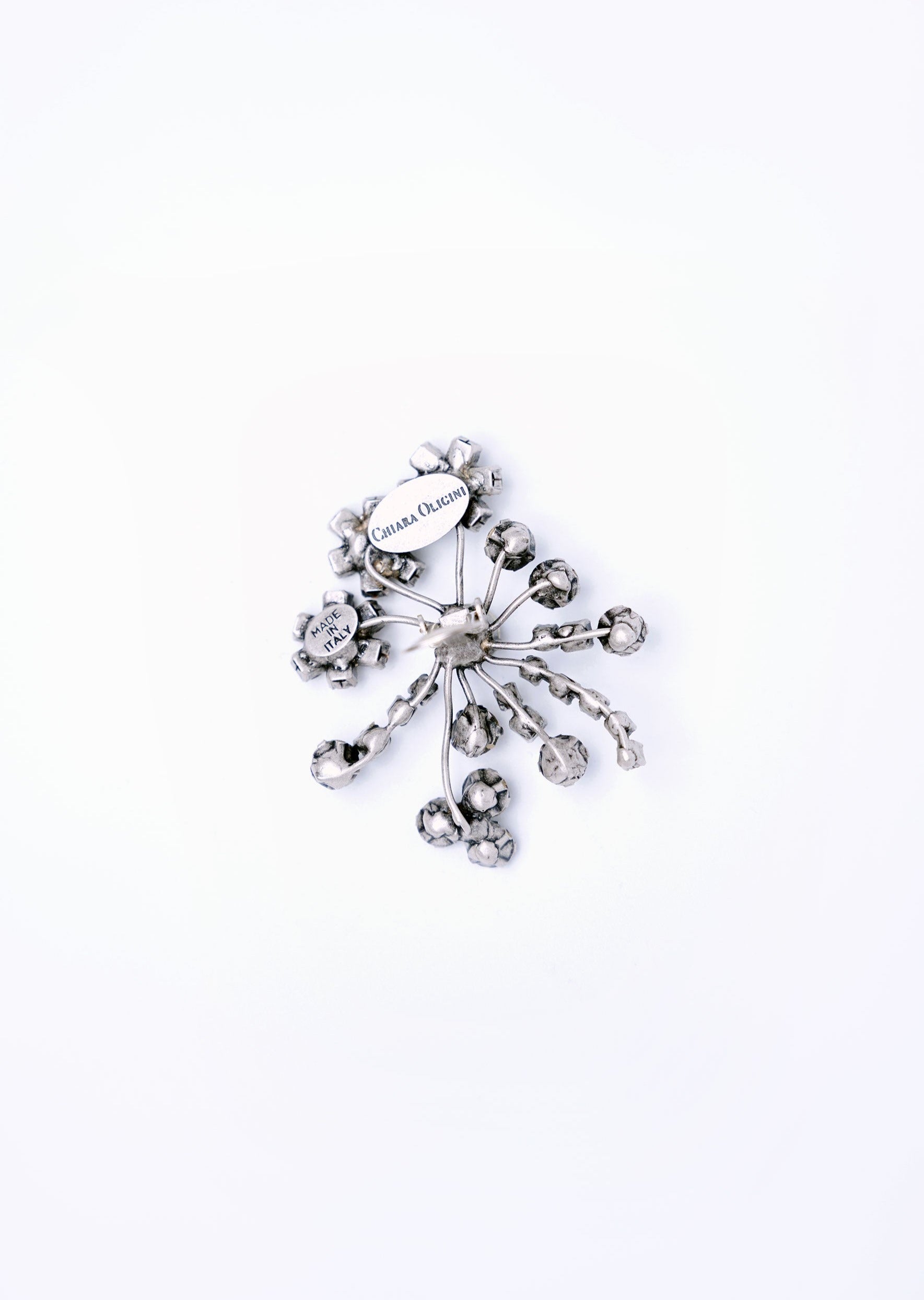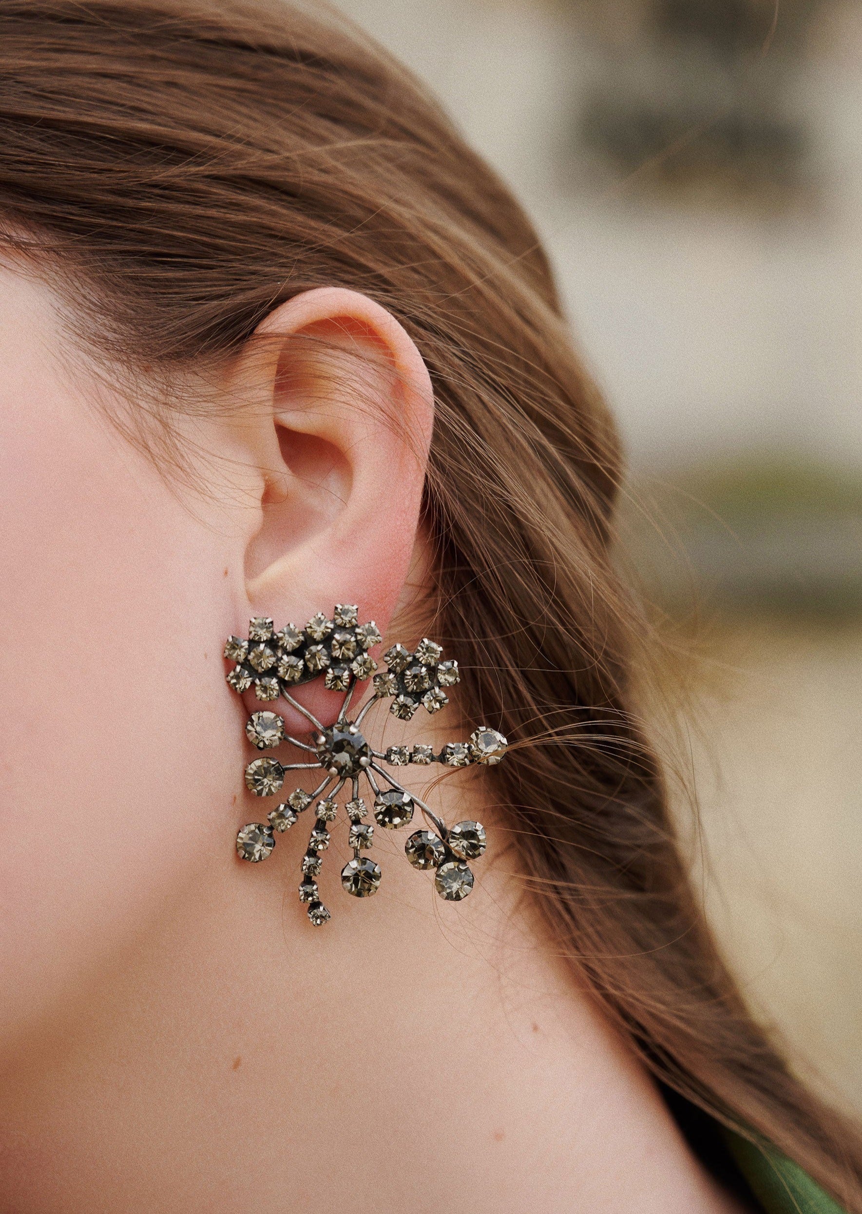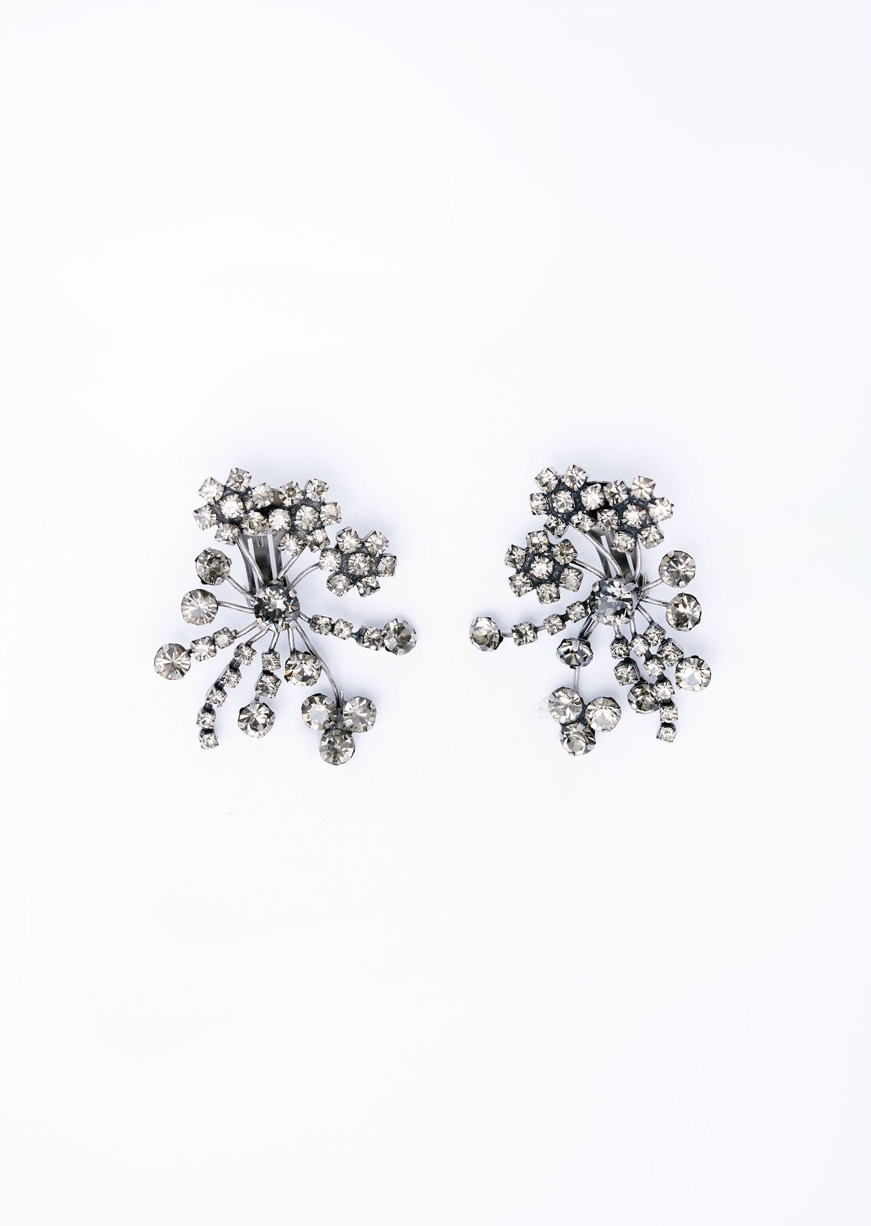 Handmade rhinestone clip earrings in antic silver tone.